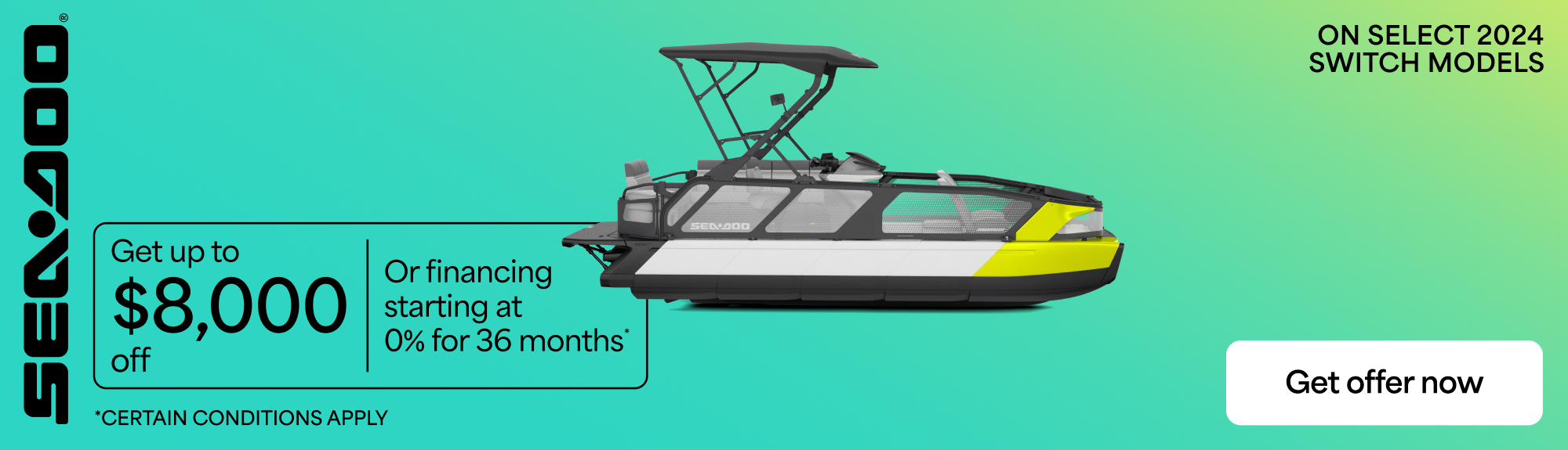 Rebates up to $8,000 or financing starting at 0% for 36 months on select 2024 Sea-Doo Switch models