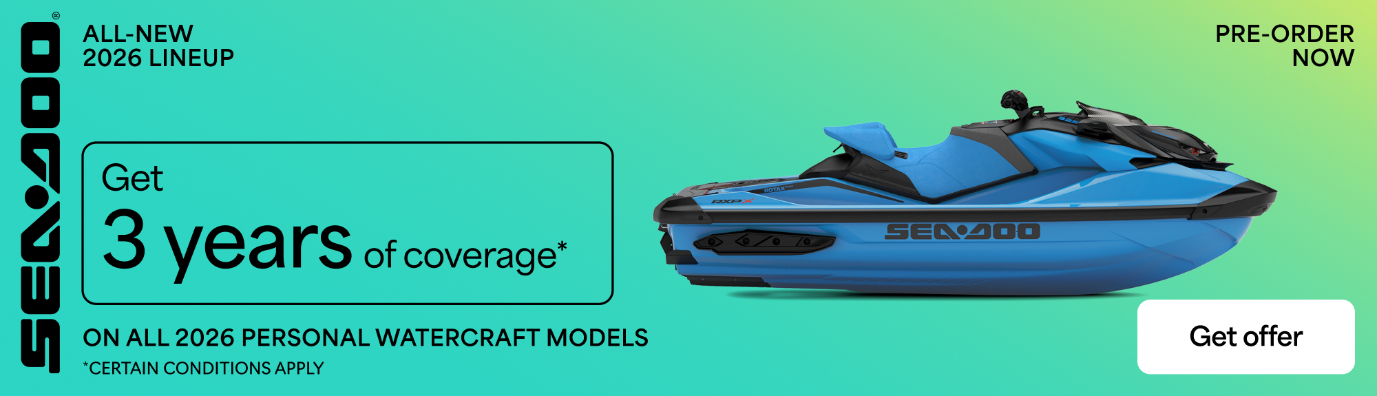Pre-order and get 3 years of coverage on all 2026 Sea-Doo PWC models